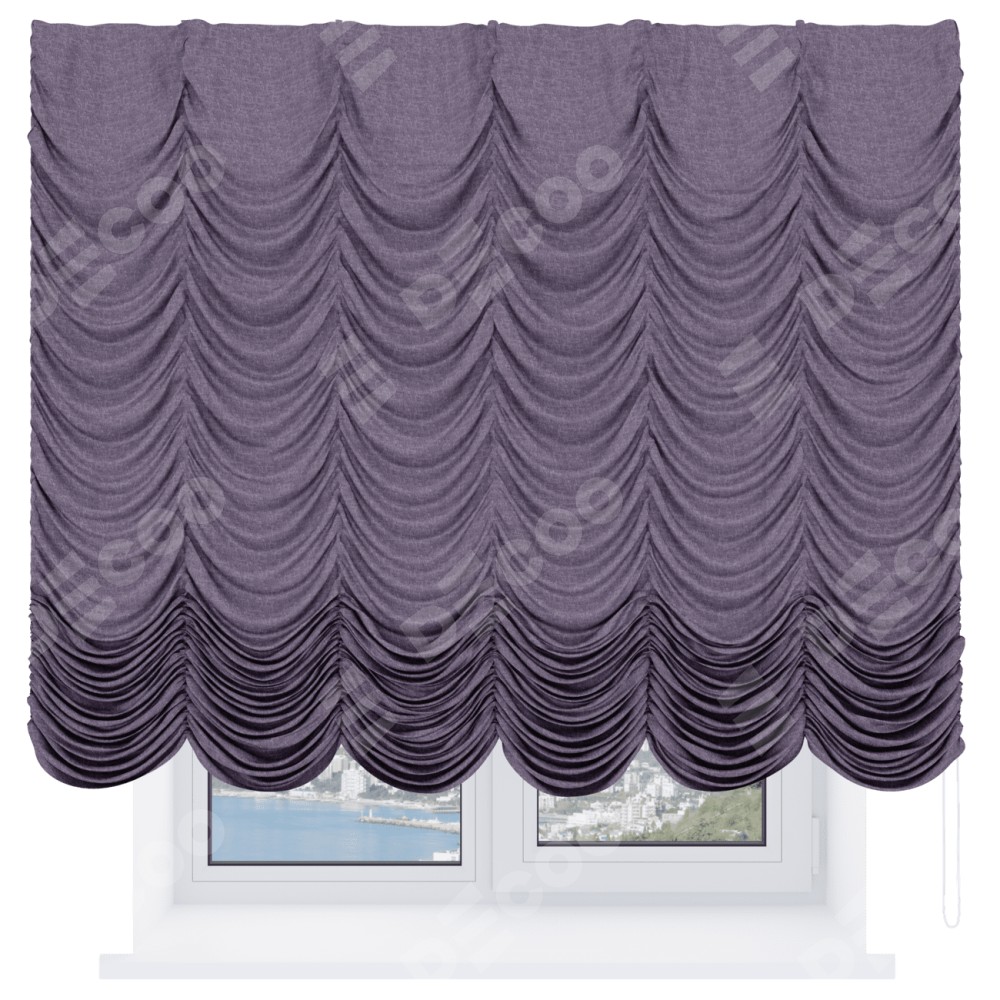 Французская штора производителя «Cortin», используется для проёма, пошита из ткани лён кашемир фиолетовый, артикул ткани 17211. Имеет универсальный механизм и подходит для монтажа: на потолок и на стену.