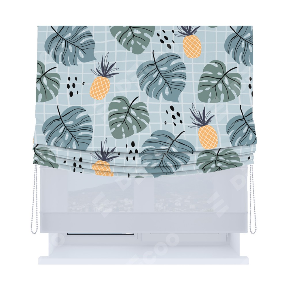 Римская штора день-ночь производителя «Cortin», используется для проёма, пошита из двух полотен, с лицевой блэкаут с нанесением сублимационной печати «Ананасы и листья монстеры», вторая ткань тюль (по стандарту комплектуется тюль белого цвета артикул V-01). Имеет универсальный механизм и подходит для монтажа: на потолок, на стену и в нишу. Удобное управление каждой шторой отдельно.