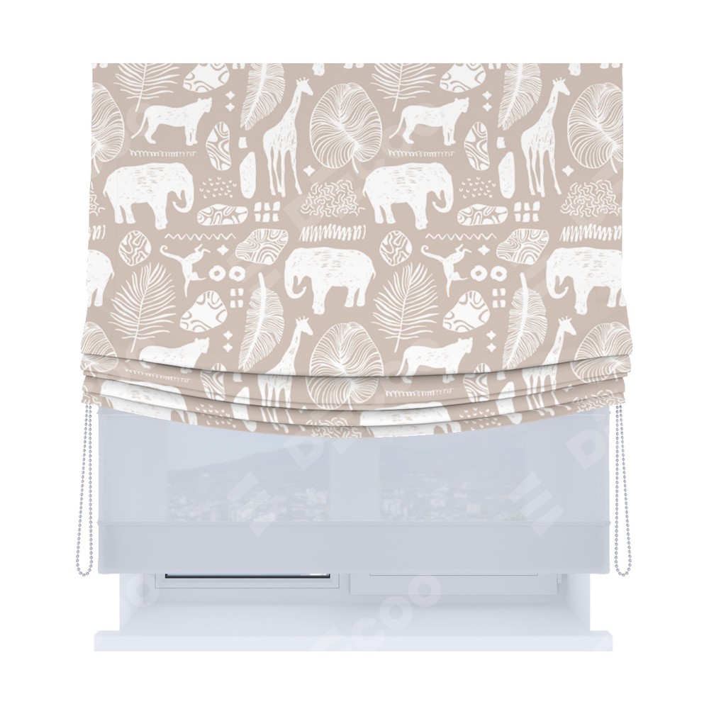 Римская штора день-ночь производителя «Cortin», используется для проёма, пошита из двух полотен, с лицевой блэкаут с нанесением сублимационной печати «Африканские животные», вторая ткань тюль (по стандарту комплектуется тюль белого цвета артикул V-01). Имеет универсальный механизм и подходит для монтажа: на потолок, на стену и в нишу. Удобное управление каждой шторой отдельно.