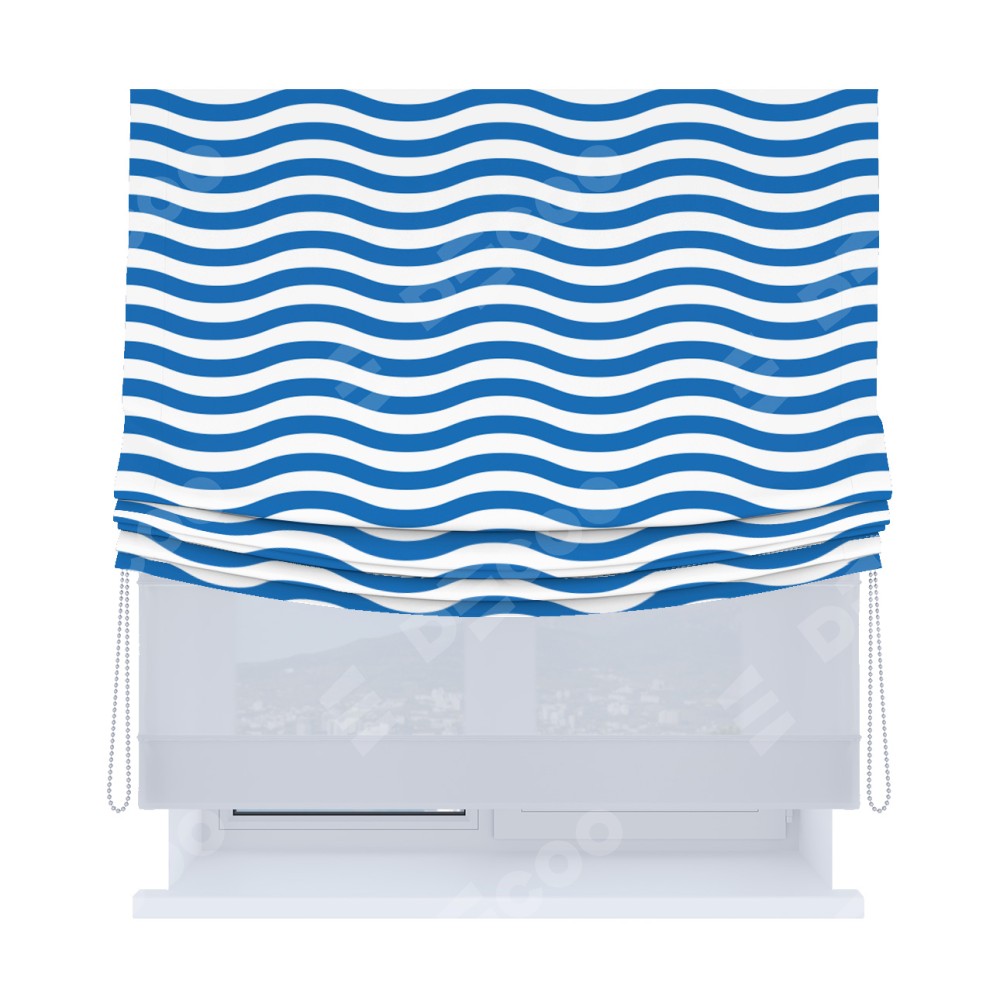 Римская штора день-ночь производителя «Cortin», используется для проёма, пошита из двух полотен, с лицевой блэкаут с нанесением сублимационной печати «Волнистые линии», вторая ткань тюль (по стандарту комплектуется тюль белого цвета артикул V-01). Имеет универсальный механизм и подходит для монтажа: на потолок, на стену и в нишу. Удобное управление каждой шторой отдельно.