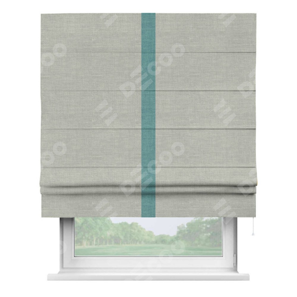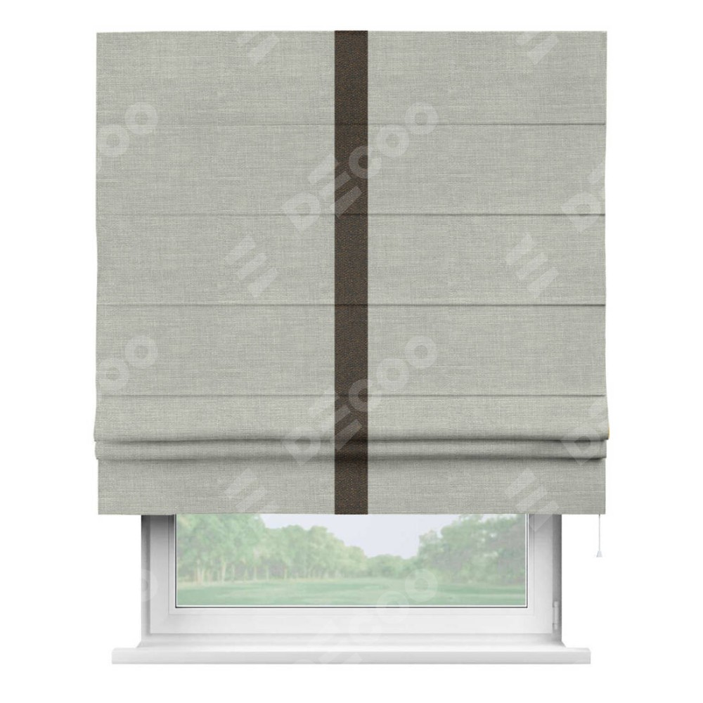 Римская штора производителя «Cortin», используется для проёма, пошита из ткани лён серый, артикул 7440. Отделка шторы кантом «Хайвэй», ткань для канта используется из льна разной расцветки на выбор. Имеет универсальный механизм и подходит для монтажа: на потолок, на стену и в нишу.