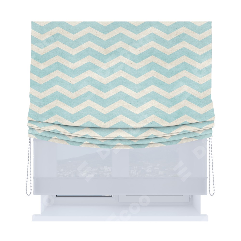 Римская штора день-ночь производителя «Cortin», используется для проёма, пошита из двух полотен, с лицевой блэкаут с нанесением сублимационной печати «Голубой шеврон», вторая ткань тюль (по стандарту комплектуется тюль белого цвета артикул V-01). Имеет универсальный механизм и подходит для монтажа: на потолок, на стену и в нишу. Удобное управление каждой шторой отдельно.