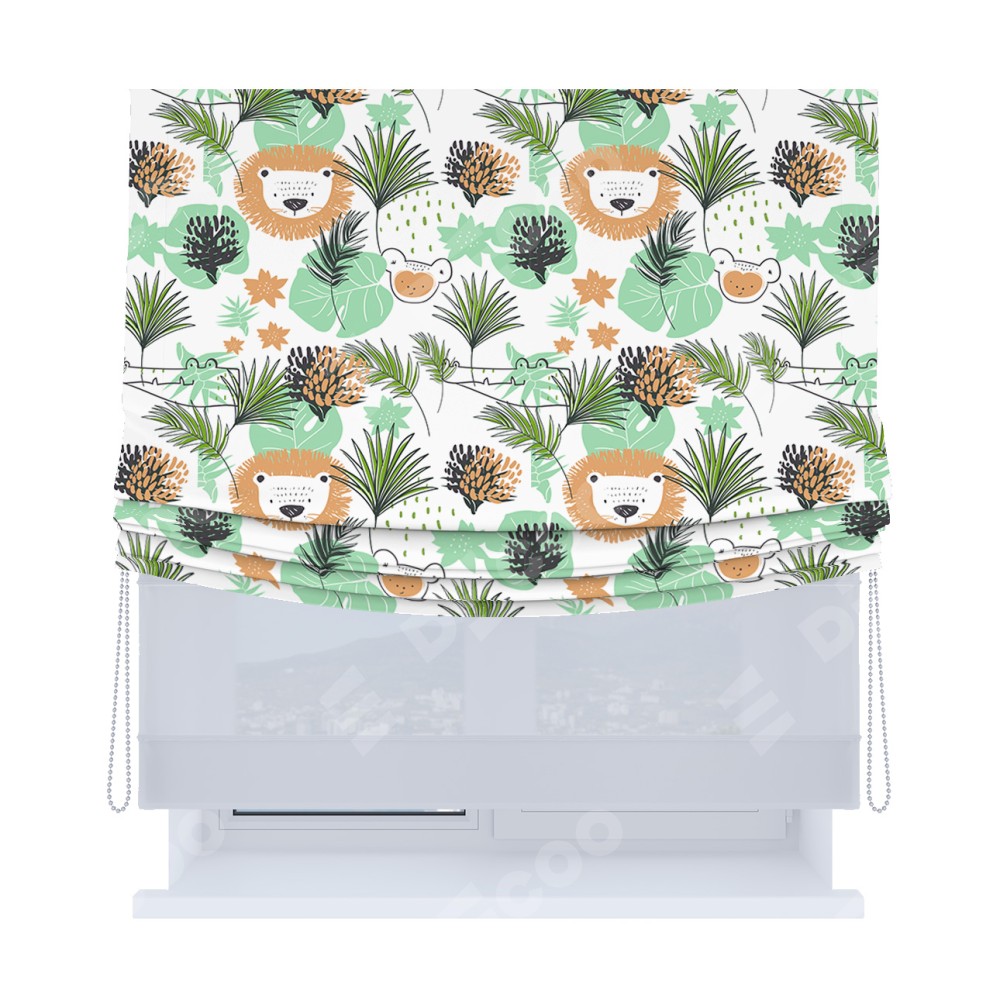Римская штора день-ночь производителя «Cortin», используется для проёма, пошита из двух полотен, с лицевой блэкаут с нанесением сублимационной печати «Животные из джунглей», вторая ткань тюль (по стандарту комплектуется тюль белого цвета артикул V-01). Имеет универсальный механизм и подходит для монтажа: на потолок, на стену и в нишу. Удобное управление каждой шторой отдельно.
