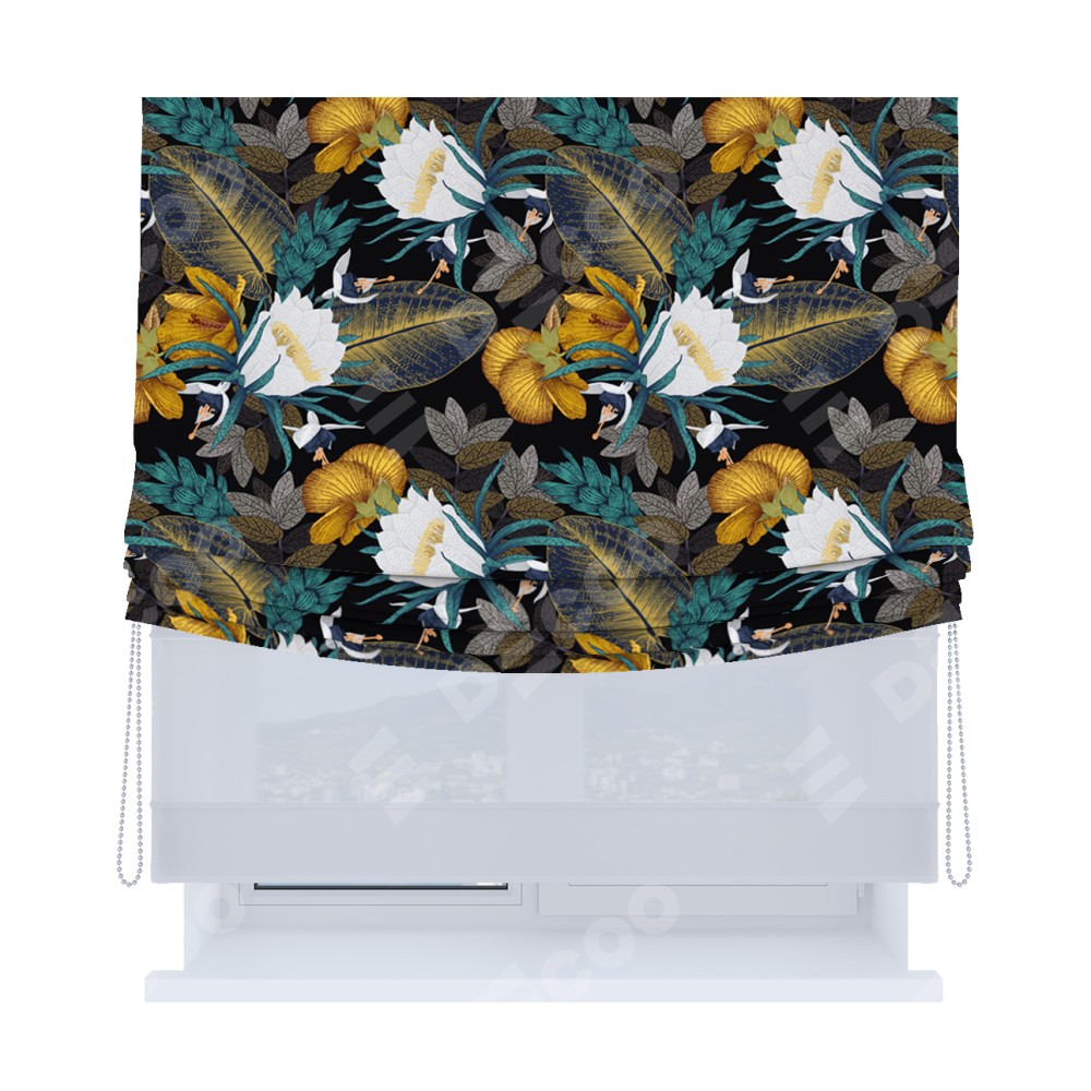 Римская штора день-ночь производителя «Cortin», используется для проёма, пошита из двух полотен, с лицевой блэкаут с нанесением сублимационной печати «Затерянный оазис», вторая ткань тюль (по стандарту комплектуется тюль белого цвета артикул V-01). Имеет универсальный механизм и подходит для монтажа: на потолок, на стену и в нишу. Удобное управление каждой шторой отдельно.