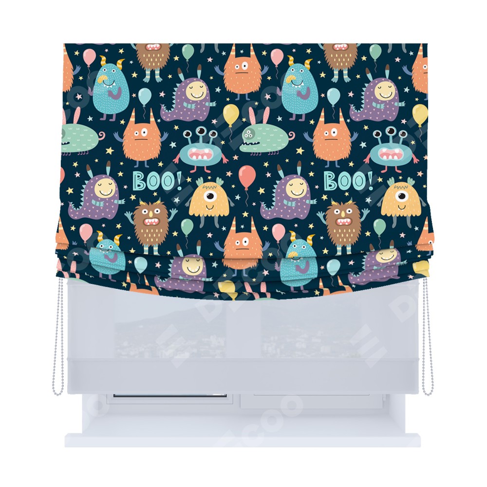 Римская штора день-ночь производителя «Cortin», используется для проёма, пошита из двух полотен, с лицевой блэкаут с нанесением сублимационной печати «Звёздные страшилки», вторая ткань тюль (по стандарту комплектуется тюль белого цвета артикул V-01). Имеет универсальный механизм и подходит для монтажа: на потолок, на стену и в нишу. Удобное управление каждой шторой отдельно.