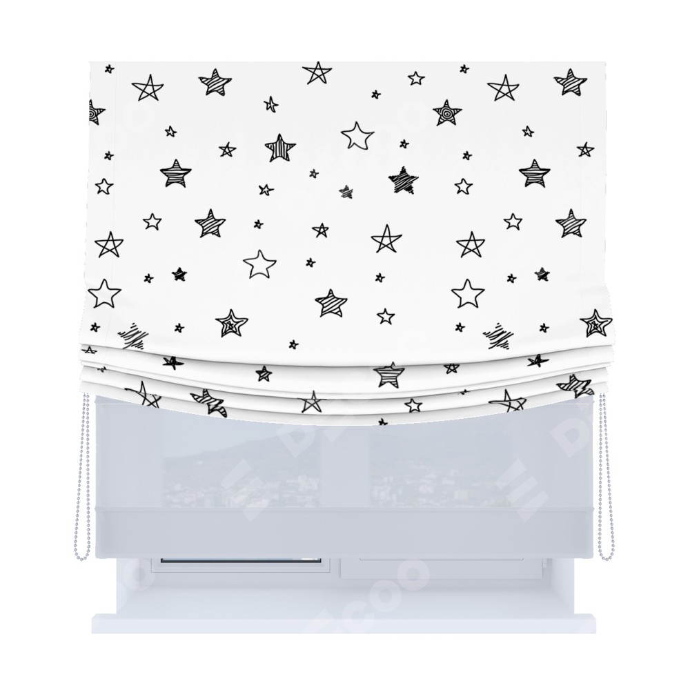 Римская штора день-ночь производителя «Cortin», используется для проёма, пошита из двух полотен, с лицевой блэкаут с нанесением сублимационной печати «Звёзды», вторая ткань тюль (по стандарту комплектуется тюль белого цвета артикул V-01). Имеет универсальный механизм и подходит для монтажа: на потолок, на стену и в нишу. Удобное управление каждой шторой отдельно.