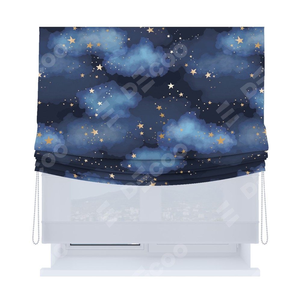 Римская штора день-ночь производителя «Cortin», используется для проёма, пошита из двух полотен, с лицевой блэкаут с нанесением сублимационной печати «Золотые звёзды», вторая ткань тюль (по стандарту комплектуется тюль белого цвета артикул V-01). Имеет универсальный механизм и подходит для монтажа: на потолок, на стену и в нишу. Удобное управление каждой шторой отдельно.