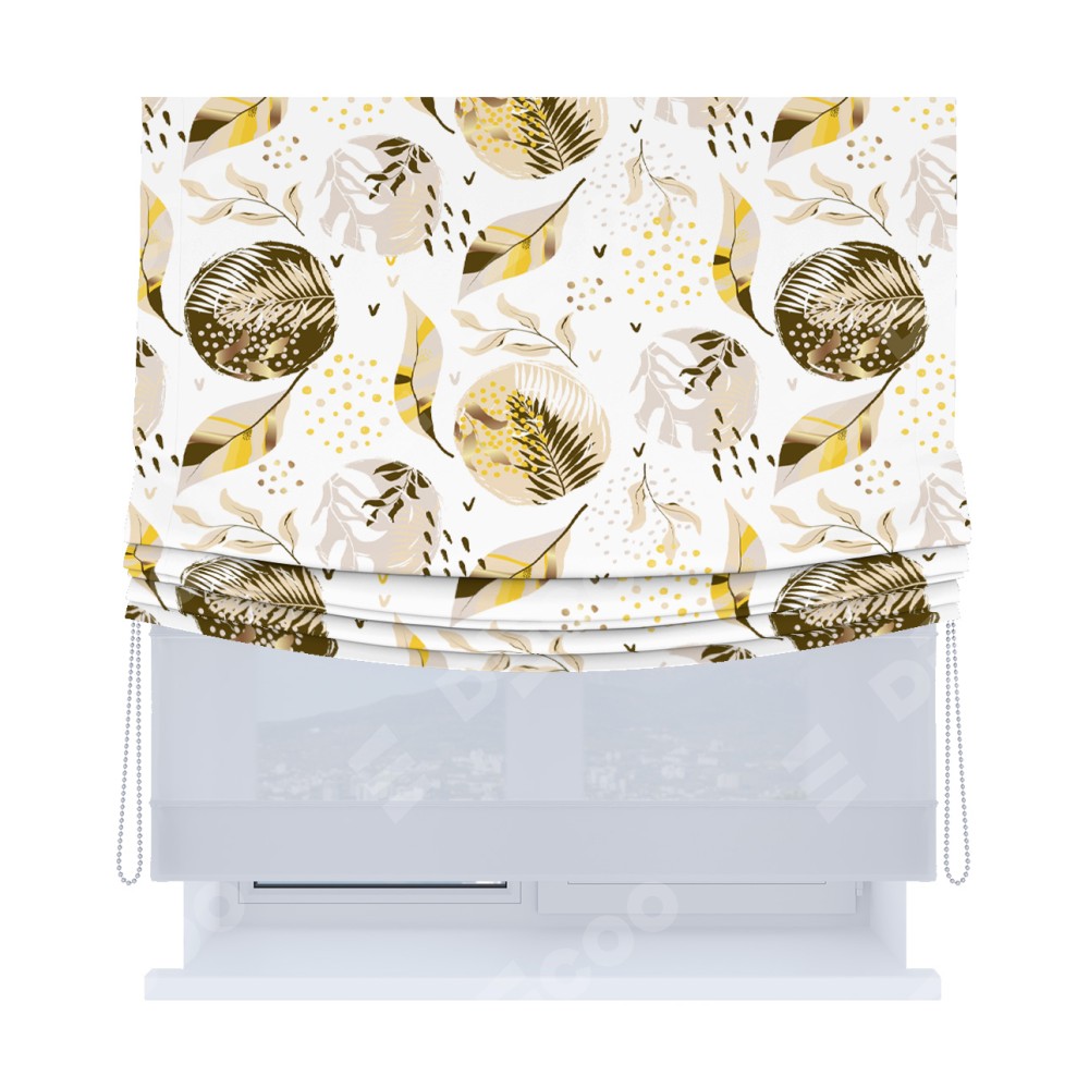 Римская штора день-ночь производителя «Cortin», используется для проёма, пошита из двух полотен, с лицевой блэкаут с нанесением сублимационной печати «Золотые листья», вторая ткань тюль (по стандарту комплектуется тюль белого цвета артикул V-01). Имеет универсальный механизм и подходит для монтажа: на потолок, на стену и в нишу. Удобное управление каждой шторой отдельно.