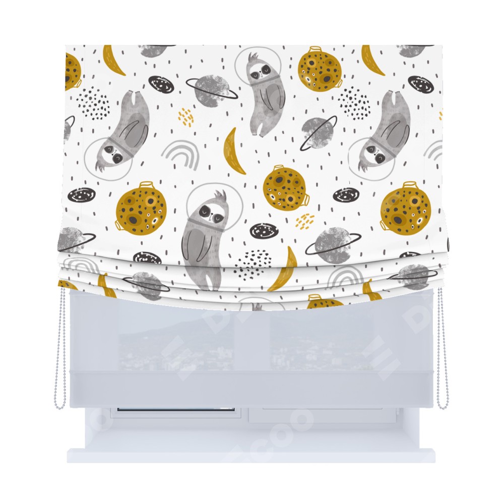 Римская штора день-ночь производителя «Cortin», используется для проёма, пошита из двух полотен, с лицевой блэкаут с нанесением сублимационной печати «Ленивец в шлеме», вторая ткань тюль (по стандарту комплектуется тюль белого цвета артикул V-01). Имеет универсальный механизм и подходит для монтажа: на потолок, на стену и в нишу. Удобное управление каждой шторой отдельно.