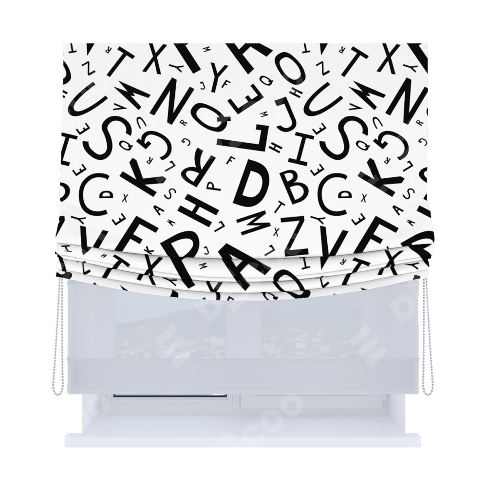 Римская штора день-ночь производителя «Cortin», используется для проёма, пошита из двух полотен, с лицевой блэкаут с нанесением сублимационной печати «Литеры на белом», вторая ткань тюль (по стандарту комплектуется тюль белого цвета артикул V-01). Имеет универсальный механизм и подходит для монтажа: на потолок, на стену и в нишу. Удобное управление каждой шторой отдельно.