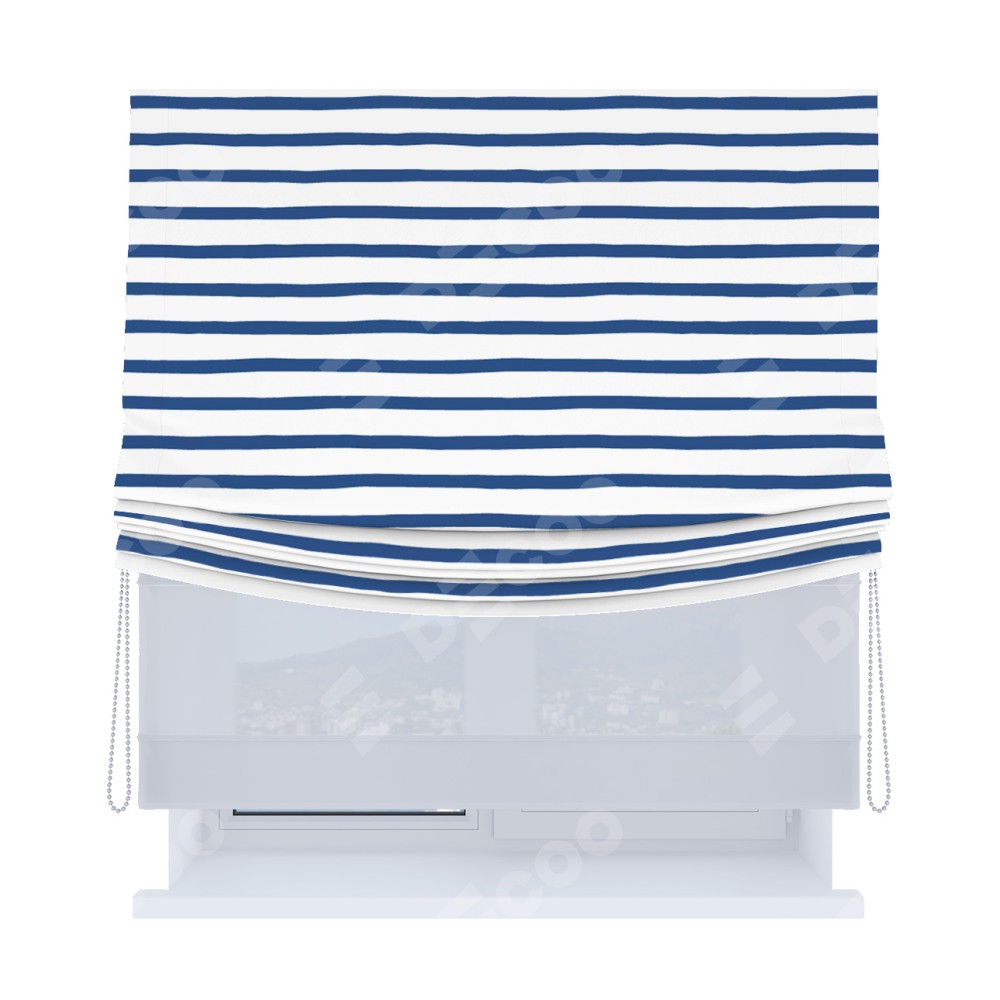 Римская штора день-ночь производителя «Cortin», используется для проёма, пошита из двух полотен, с лицевой блэкаут с нанесением сублимационной печати «Морская полоска», вторая ткань тюль (по стандарту комплектуется тюль белого цвета артикул V-01). Имеет универсальный механизм и подходит для монтажа: на потолок, на стену и в нишу. Удобное управление каждой шторой отдельно.