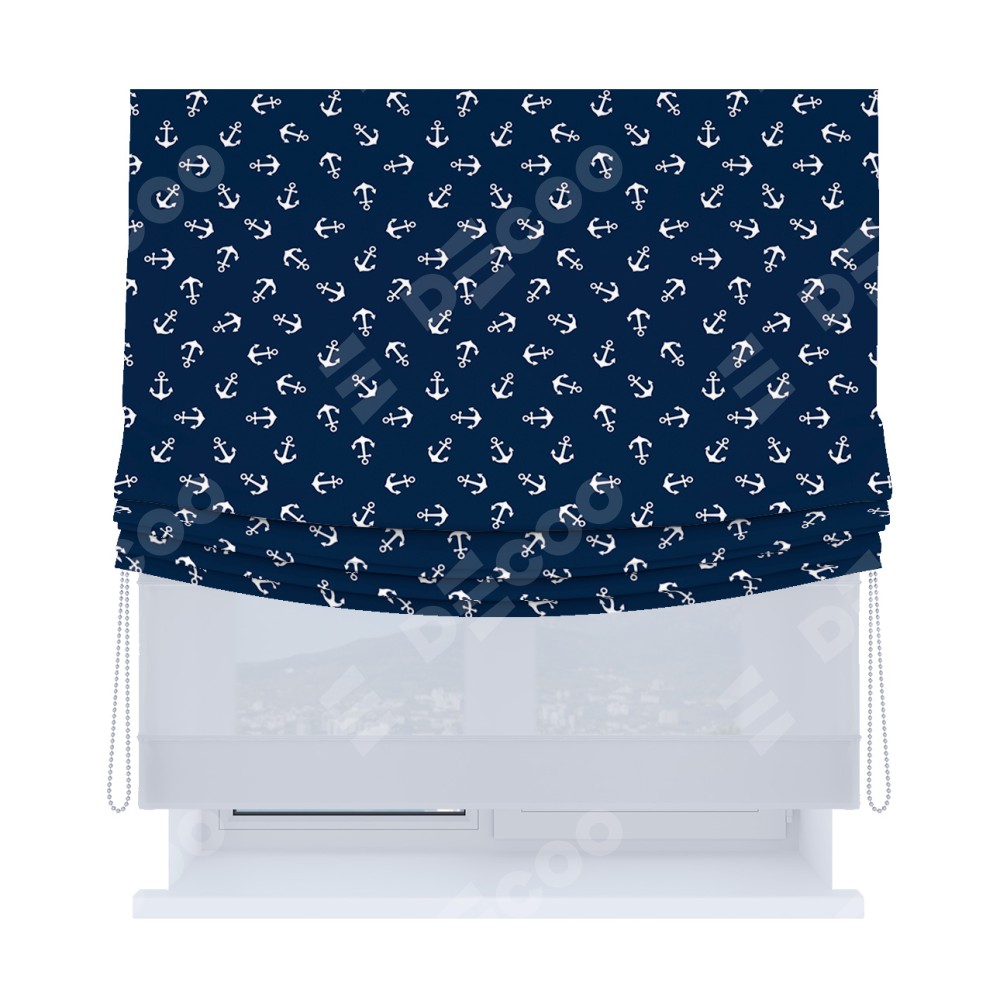 Римская штора день-ночь производителя «Cortin», используется для проёма, пошита из двух полотен, с лицевой блэкаут с нанесением сублимационной печати «Морские якори», вторая ткань тюль (по стандарту комплектуется тюль белого цвета артикул V-01). Имеет универсальный механизм и подходит для монтажа: на потолок, на стену и в нишу. Удобное управление каждой шторой отдельно.