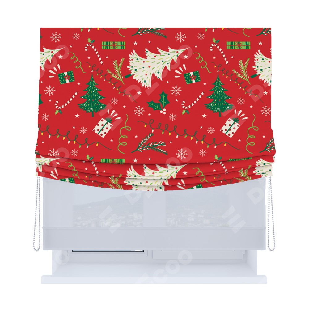 Римская штора день-ночь производителя «Cortin», используется для проёма, пошита из двух полотен, с лицевой блэкаут с нанесением сублимационной печати «Новогодние подарки», вторая ткань тюль (по стандарту комплектуется тюль белого цвета артикул V-01). Имеет универсальный механизм и подходит для монтажа: на потолок, на стену и в нишу. Удобное управление каждой шторой отдельно.