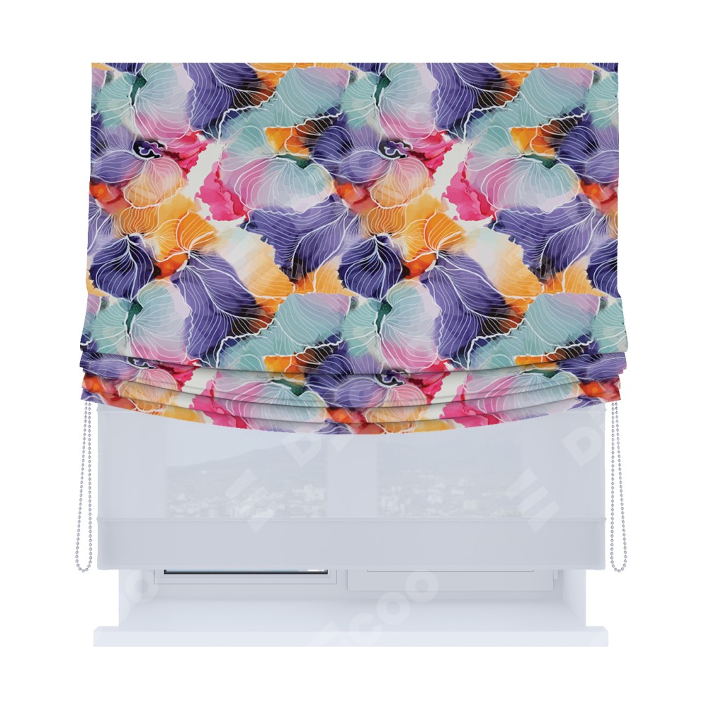 Римская штора день-ночь производителя «Cortin», используется для проёма, пошита из двух полотен, с лицевой блэкаут с нанесением сублимационной печати «Роскошные ирисы», вторая ткань тюль (по стандарту комплектуется тюль белого цвета артикул V-01). Имеет универсальный механизм и подходит для монтажа: на потолок, на стену и в нишу. Удобное управление каждой шторой отдельно.