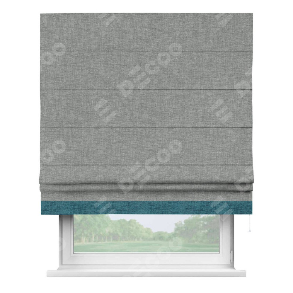 Римская штора производителя «Cortin», используется для проёма, пошита из ткани рогожка димаут тёмно-серый, артикул 80418. Отделка шторы кантом «Джестер», ткань для канта используется из рогожки димаут разной расцветки на выбор. Имеет универсальный механизм и подходит для монтажа: на потолок, на стену и в нишу.