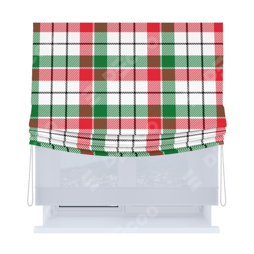 Римская штора день-ночь производителя «Cortin», используется для проёма, пошита из двух полотен, с лицевой блэкаут с нанесением сублимационной печати «Трёхцветная клетка», вторая ткань тюль (по стандарту комплектуется тюль белого цвета артикул V-01). Имеет универсальный механизм и подходит для монтажа: на потолок, на стену и в нишу. Удобное управление каждой шторой отдельно.