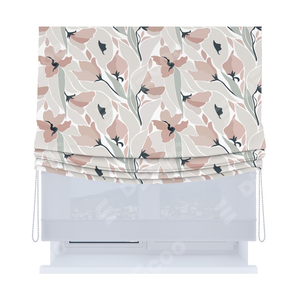 Римская штора день-ночь производителя «Cortin», используется для проёма, пошита из двух полотен, с лицевой блэкаут с нанесением сублимационной печати «Тюльпаны пастель», вторая ткань тюль (по стандарту комплектуется тюль белого цвета артикул V-01). Имеет универсальный механизм и подходит для монтажа: на потолок, на стену и в нишу. Удобное управление каждой шторой отдельно.