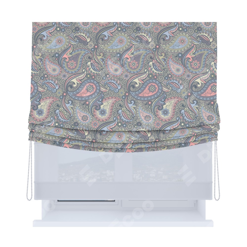 Римская штора день-ночь производителя «Cortin», используется для проёма, пошита из двух полотен, с лицевой блэкаут с нанесением сублимационной печати «Цветной пейсли», вторая ткань тюль (по стандарту комплектуется тюль белого цвета артикул V-01). Имеет универсальный механизм и подходит для монтажа: на потолок, на стену и в нишу. Удобное управление каждой шторой отдельно.