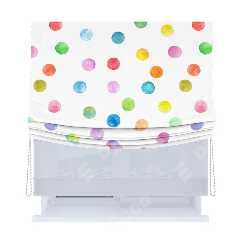 Римская штора день-ночь производителя «Cortin», используется для проёма, пошита из двух полотен, с лицевой блэкаут с нанесением сублимационной печати «Цветные круги», вторая ткань тюль (по стандарту комплектуется тюль белого цвета артикул V-01). Имеет универсальный механизм и подходит для монтажа: на потолок, на стену и в нишу. Удобное управление каждой шторой отдельно.