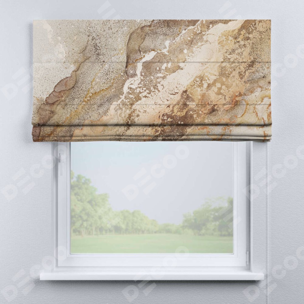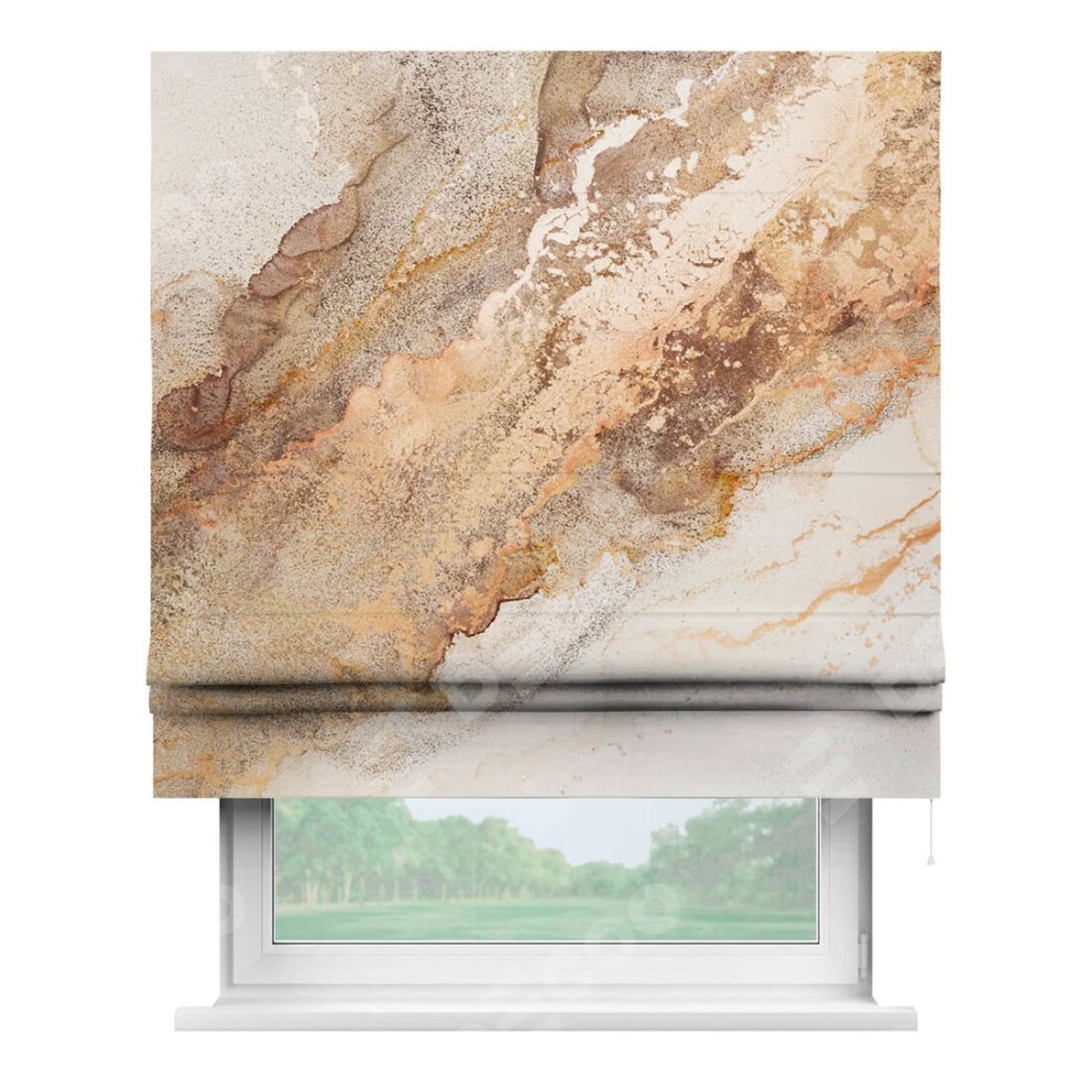 Римская штора производителя «Cortin», используется для проёма, пошита из ткани блэкаут с нанесением сублимационной печати «Бежево-золотой мрамор». Имеет универсальный механизм и подходит для монтажа: на потолок, на стену и в нишу.
