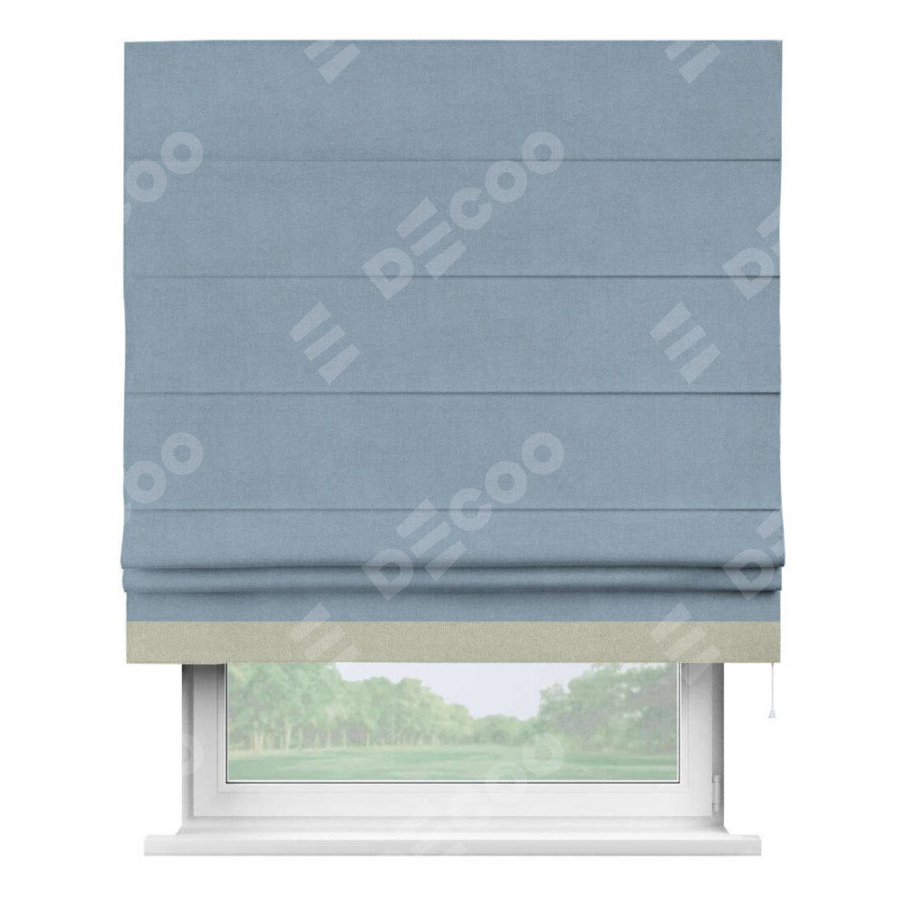 Римская штора производителя «Cortin», используется для проёма, пошита из ткани лён блэкаут голубой, артикул 69574. Отделка шторы кантом «Джестер», ткань для канта используется из льна разной расцветки на выбор. Имеет универсальный механизм и подходит для монтажа: на потолок, на стену и в нишу.