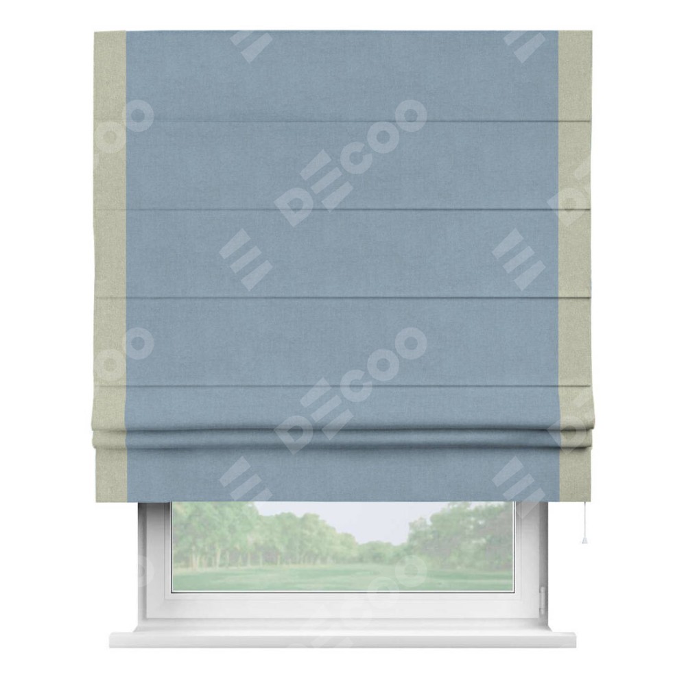 Римская штора производителя «Cortin», используется для проёма, пошита из ткани лён блэкаут голубой, артикул 69574. Отделка шторы кантом «Стрим Дуо», ткань для канта используется из льна разной расцветки на выбор. Имеет универсальный механизм и подходит для монтажа: на потолок, на стену и в нишу.
