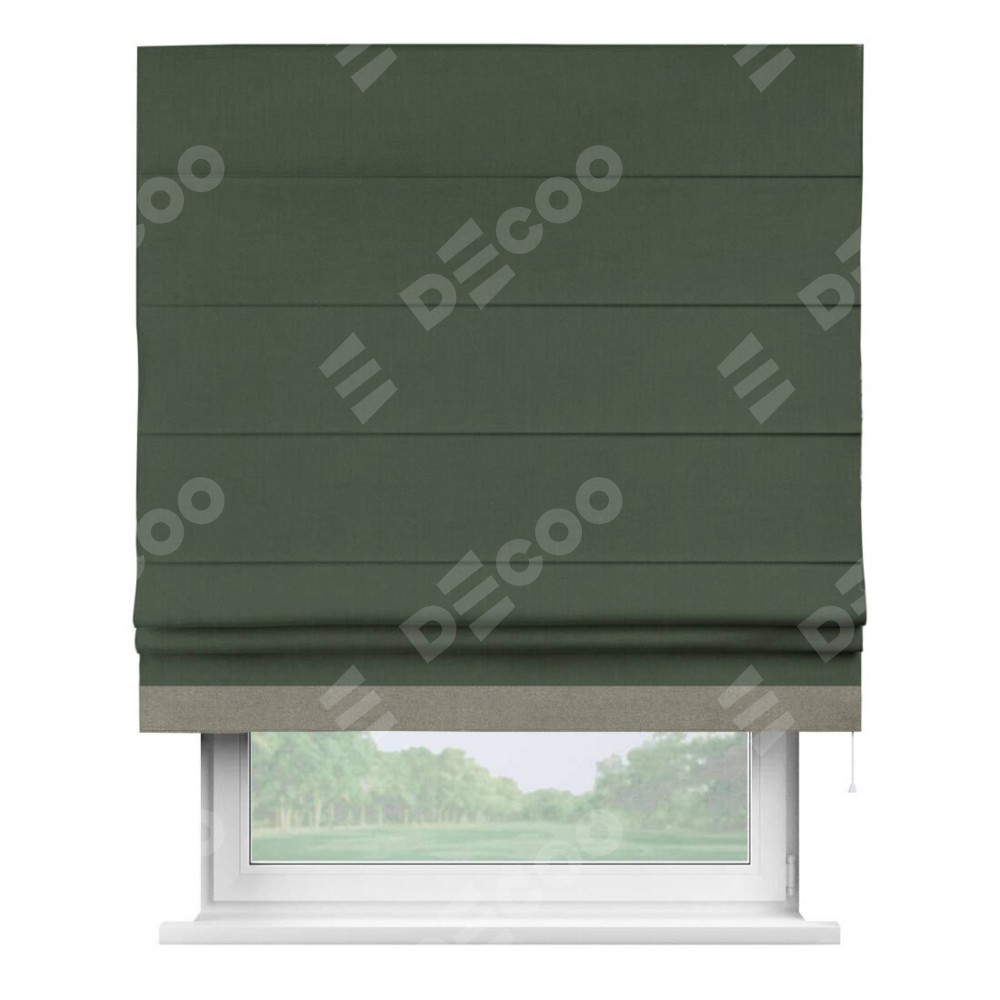 Римская штора производителя «Cortin», используется для проёма, пошита из ткани лён блэкаут зелёный, артикул 69497. Отделка шторы кантом «Джестер», ткань для канта используется из льна разной расцветки на выбор. Имеет универсальный механизм и подходит для монтажа: на потолок, на стену и в нишу.