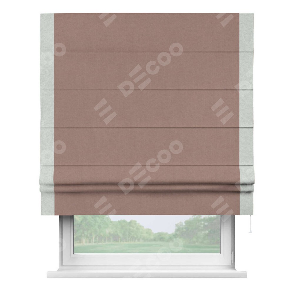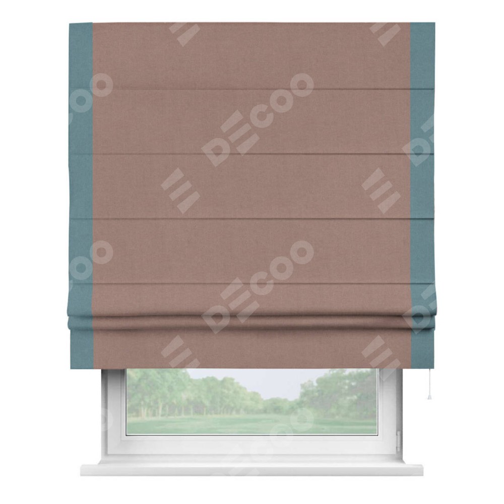 Римская штора производителя «Cortin», используется для проёма, пошита из ткани лён блэкаут розовый, артикул 69575. Отделка шторы кантом «Стрим Дуо», ткань для канта используется из льна разной расцветки на выбор. Имеет универсальный механизм и подходит для монтажа: на потолок, на стену и в нишу.
