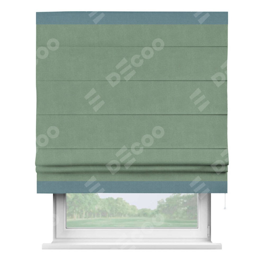 Римская штора производителя «Cortin», используется для проёма, пошита из ткани лён блэкаут светло-бирюзовый, артикул 69443. Отделка шторы кантом «Горизонт», ткань для канта используется из льна разной расцветки на выбор. Имеет универсальный механизм и подходит для монтажа: на потолок, на стену и в нишу.