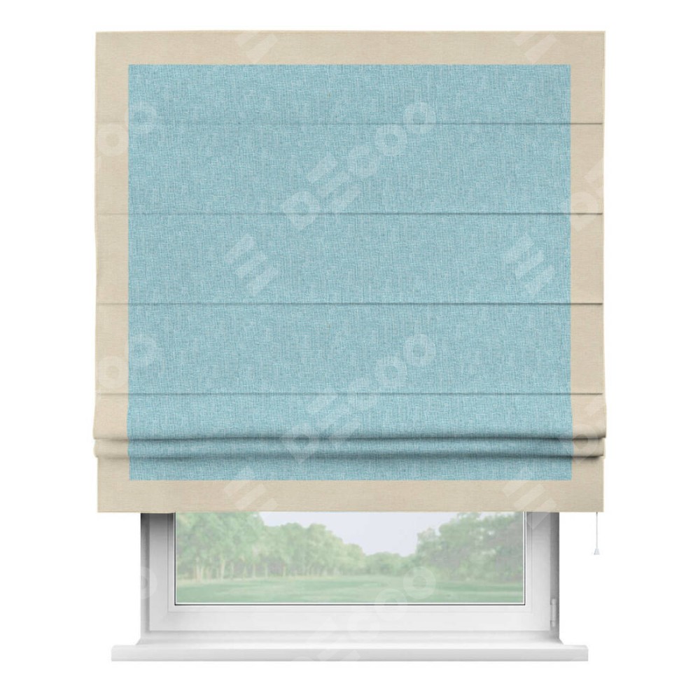 Римская штора производителя «Cortin», используется для проёма, пошита из ткани лён кашемир голубой, артикул 21616. Отделка шторы кантом «Чесс», ткань для канта используется из льна разной расцветки на выбор. Имеет универсальный механизм и подходит для монтажа: на потолок, на стену и в нишу.