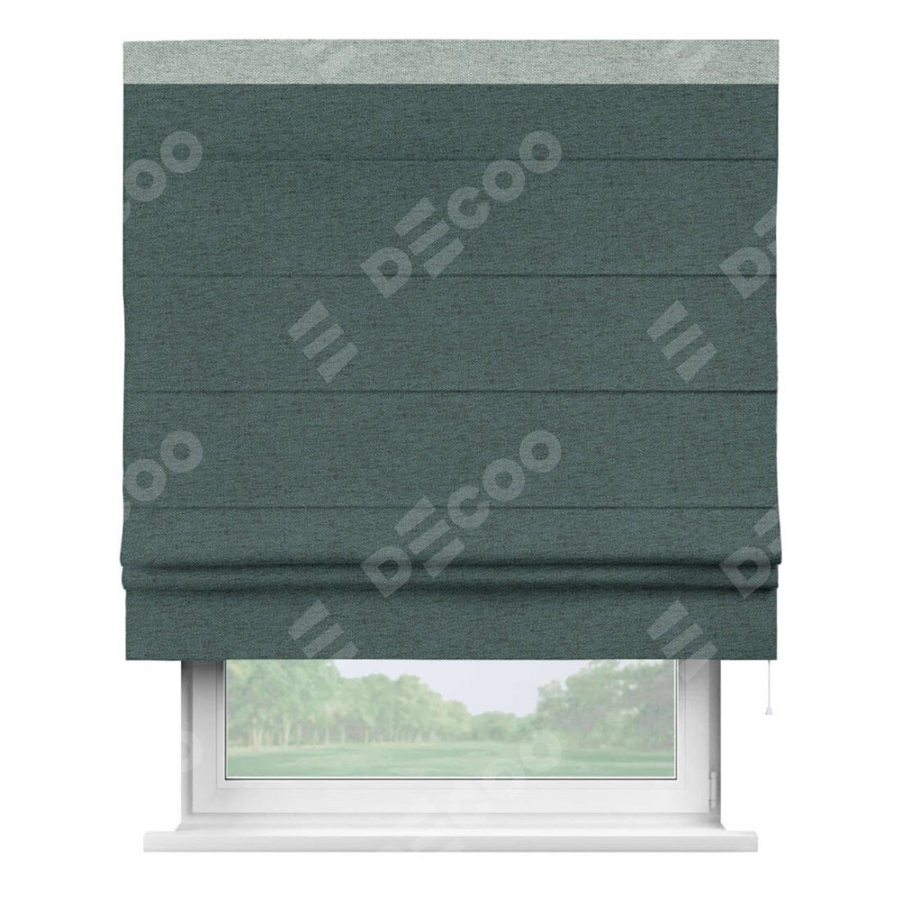 Римская штора производителя «Cortin», используется для проёма, пошита из ткани стиф димаут сине-зелёный, артикул 18194. Отделка шторы кантом «Кинг», ткань для канта используется из стифа разной расцветки на выбор. Имеет универсальный механизм и подходит для монтажа: на потолок, на стену и в нишу.