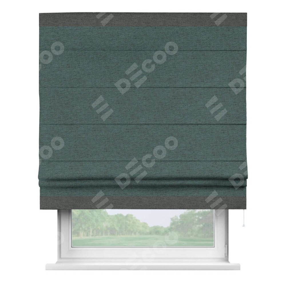 Римская штора производителя «Cortin», используется для проёма, пошита из ткани стиф димаут сине-зелёный, артикул 18194. Отделка шторы кантом «Горизонт», ткань для канта используется из стифа разной расцветки на выбор. Имеет универсальный механизм и подходит для монтажа: на потолок, на стену и в нишу.