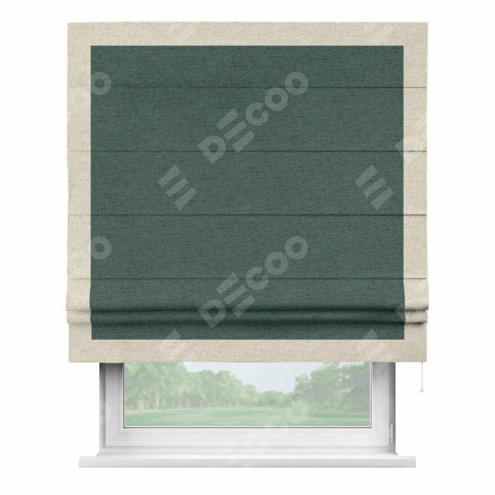 Римская штора производителя «Cortin», используется для проёма, пошита из ткани стиф димаут сине-зелёный, артикул 18194. Отделка шторы кантом «Чесс», ткань для канта используется из стифа разной расцветки на выбор. Имеет универсальный механизм и подходит для монтажа: на потолок, на стену и в нишу.