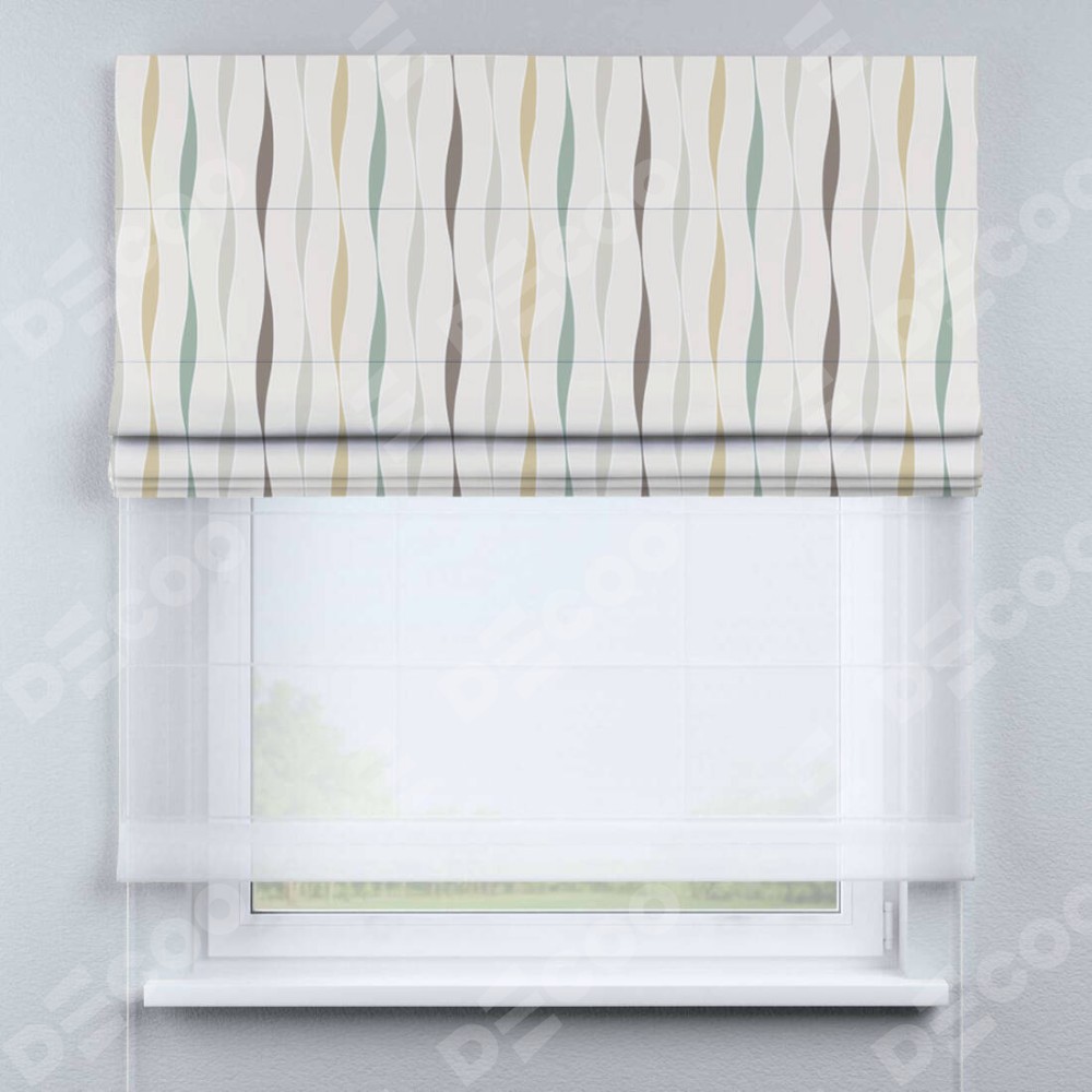 Римская штора день-ночь производителя «Cortin», используется для проёма, пошита из двух полотен, с лицевой блэкаут с нанесением сублимационной печати «Дельта», вторая ткань тюль (по стандарту комплектуется тюль белого цвета артикул V-01). Имеет универсальный механизм и подходит для монтажа: на потолок, на стену и в нишу.