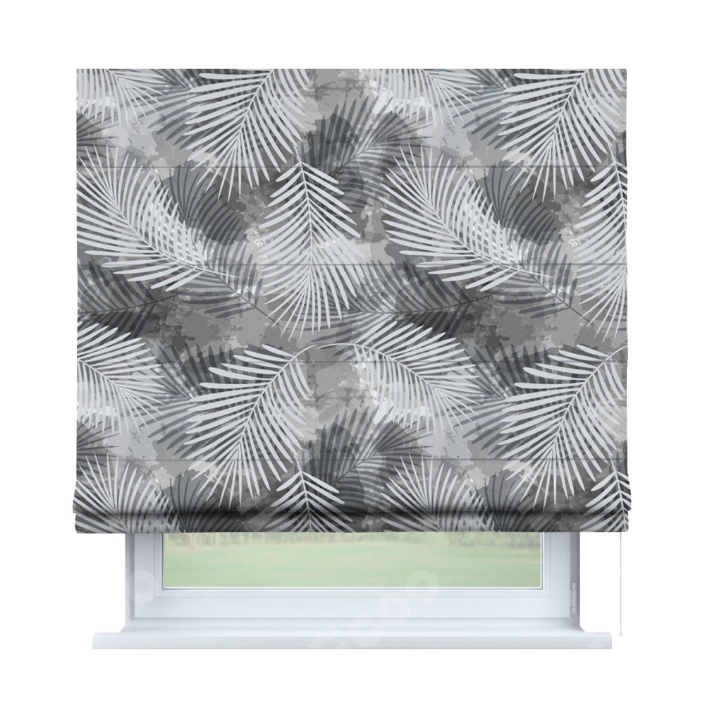Римская штора производителя «Cortin», используется для проёма, пошита из ткани блэкаут с нанесением сублимационной печати «Листья в тени». Имеет универсальный механизм и подходит для монтажа: на потолок, на стену и в нишу.