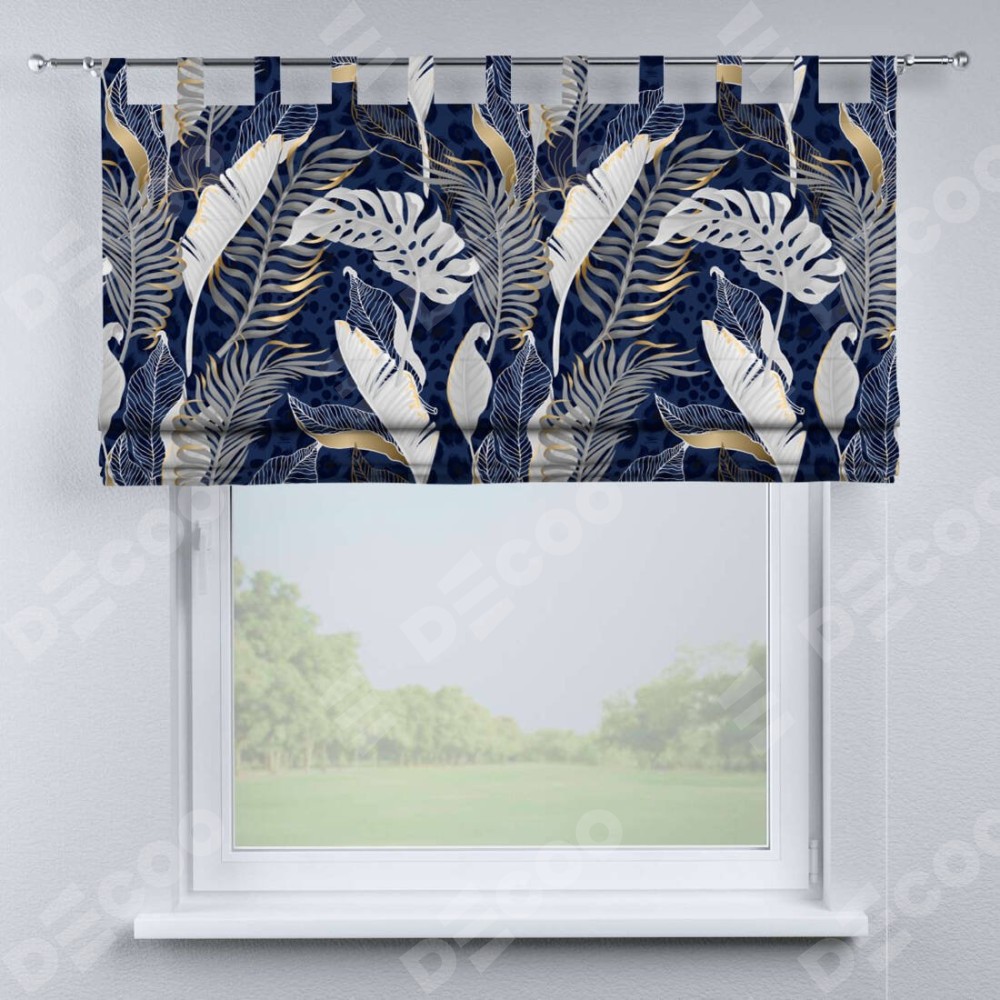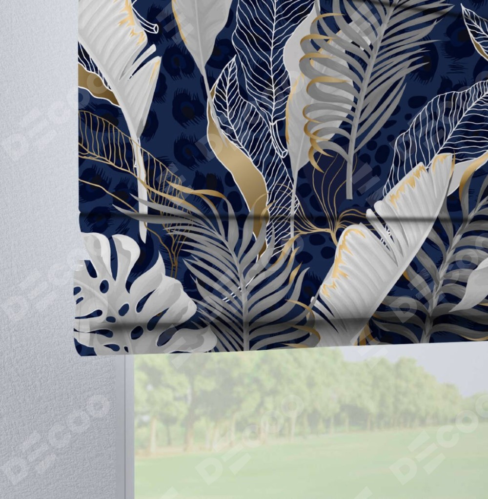 Римская штора производителя «Cortin», используется для проёма, пошита из ткани блэкаут с нанесением сублимационной печати «Сине-золотые джунгли». Данная модель пошита на петлях, комплектуется на выбор круглым карнизом и подходит для монтажа на стену. Римская штора на петлях имеет простую систему регулировки высоты, отличительным преимуществом данной модели является простой способ монтажа. Достаточно повесить ее на трубу и штора готова!