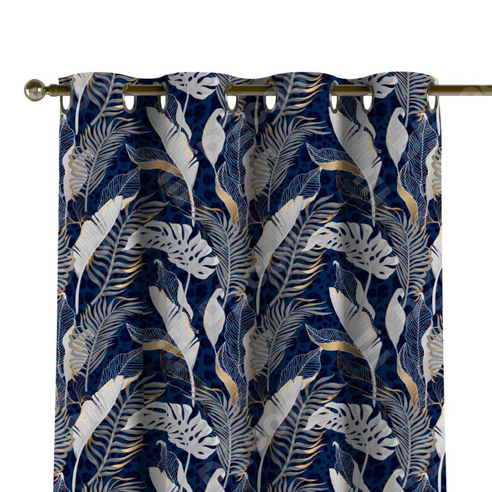 Комплект прямых штор, от производителя «Cortin», пошиты из ткани блэкаут с нанесением сублимационной печати «Сине-золотые джунгли». Данная модель пошита на люверсах, комплектуется на выбор круглым карнизом и подходит для монтажа на стену или потолок. Прямые шторы на люверсах шьются по стандарту с коэффициентом 1/2 (на 100 см. ширины проёма 200 см. ширины ткани), отличительным преимуществом данной модели является простой способ монтажа. Достаточно повесить ее на трубу и штора готова!
