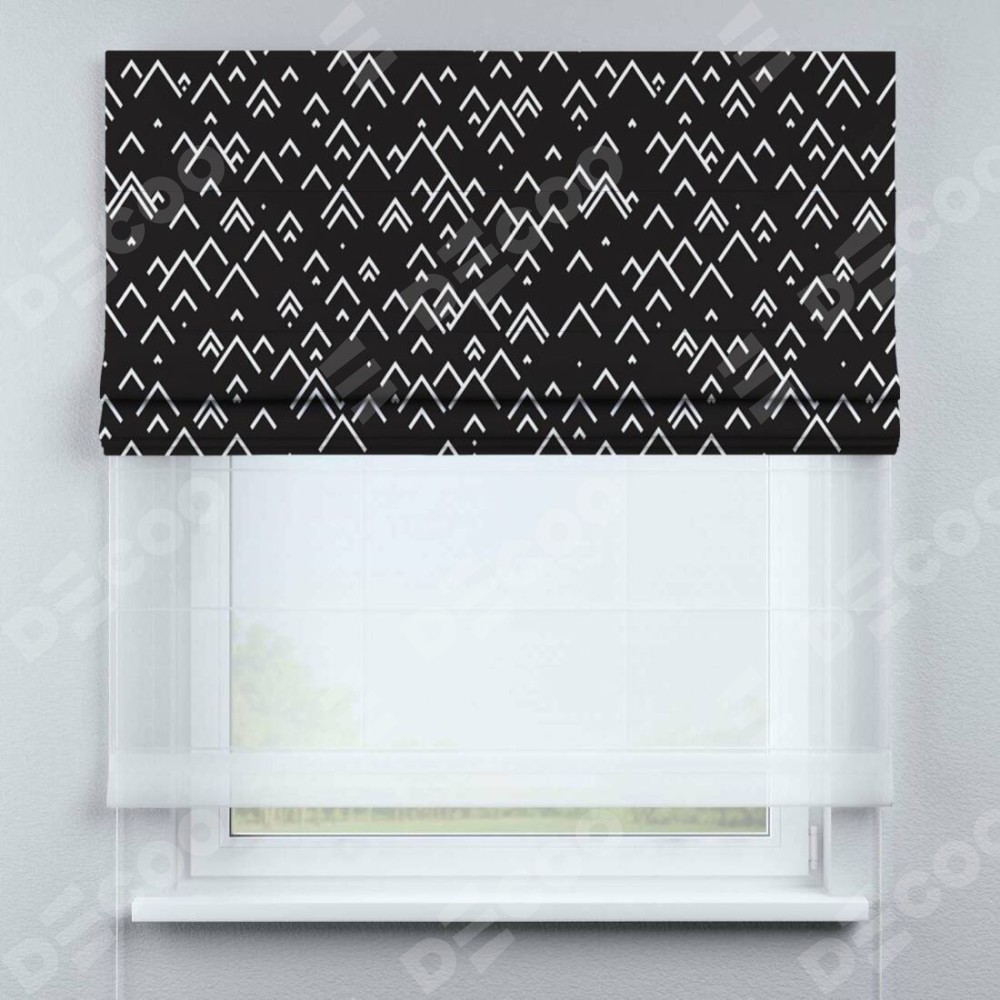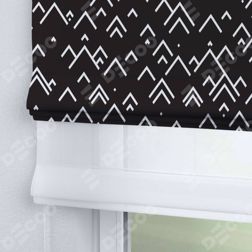 Римская штора день-ночь производителя «Cortin», используется для проёма, пошита из двух полотен, с лицевой блэкаут с нанесением сублимационной печати «Черно-белый минимализм», вторая ткань тюль (по стандарту комплектуется тюль белого цвета артикул V-01). Имеет универсальный механизм и подходит для монтажа: на потолок, на стену и в нишу.