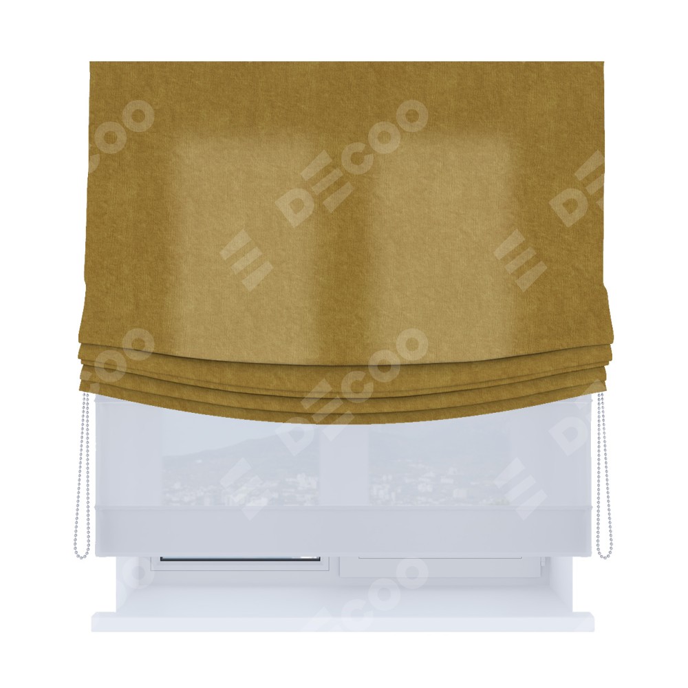 Римская штора день-ночь производителя «Cortin», используется для проёма, пошита из двух полотен, с лицевой стороны канвас горчица артикул v-476, вторая ткань тюль (по стандарту комплектуется тюль белого цвета артикул V-01). Имеет универсальный механизм и подходит для монтажа: на потолок, на стену и в нишу. Удобное управление каждой шторой отдельно.