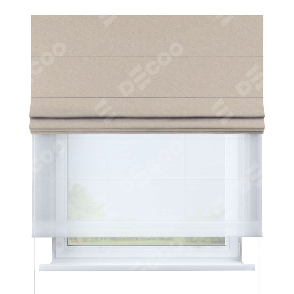 Римская штора день-ночь производителя «Cortin», используется для проёма, пошита из двух полотен, с лицевой стороны канвас кофе с молоком артикул v-07, вторая ткань тюль (по стандарту комплектуется тюль белого цвета артикул V-01). Имеет универсальный механизм и подходит для монтажа: на потолок, на стену и в нишу.