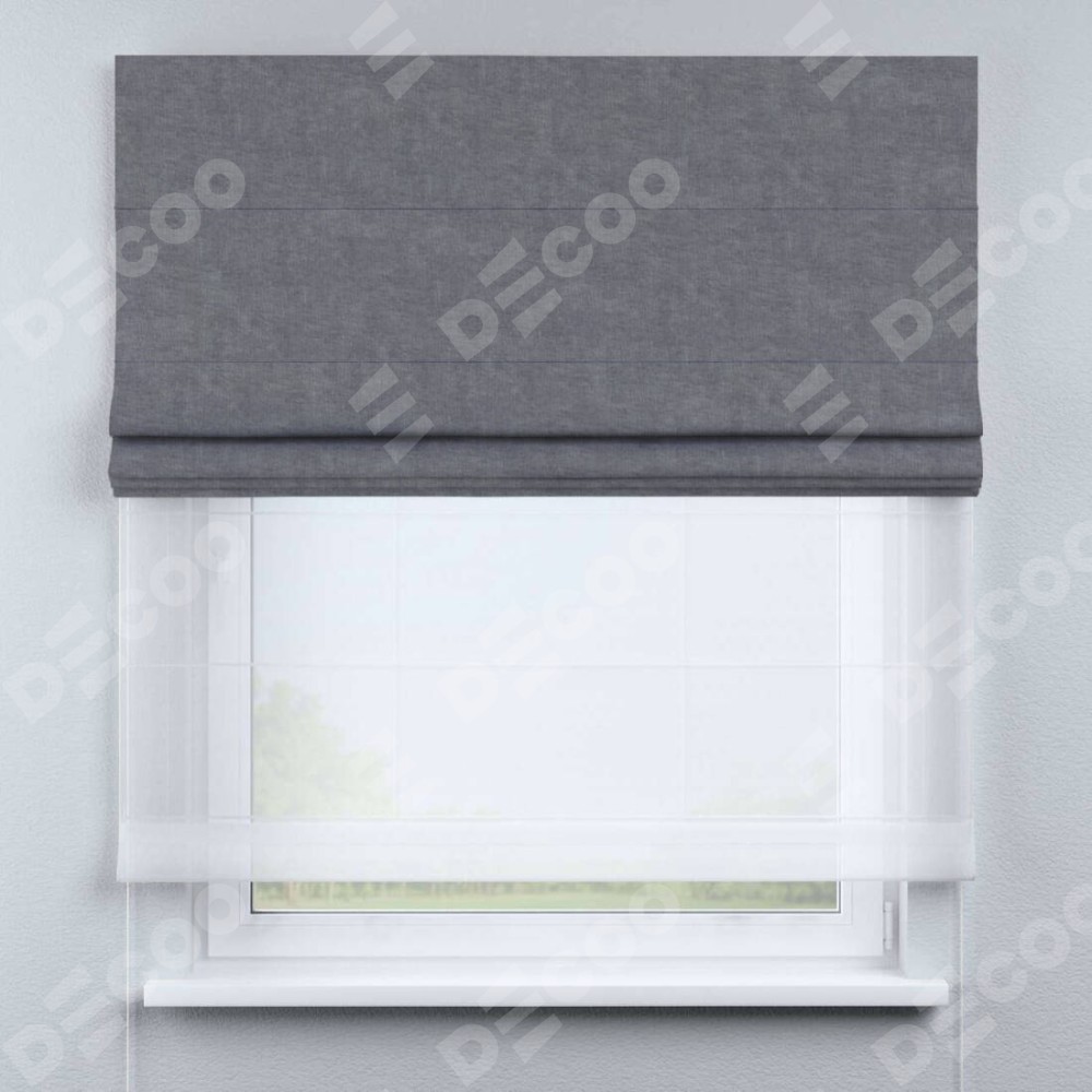 Римская штора день-ночь производителя «Cortin», используется для проёма, пошита из двух полотен, с лицевой стороны канвас стальной артикул v-1082, вторая ткань тюль (по стандарту комплектуется тюль белого цвета артикул V-01). Имеет универсальный механизм и подходит для монтажа: на потолок, на стену и в нишу.