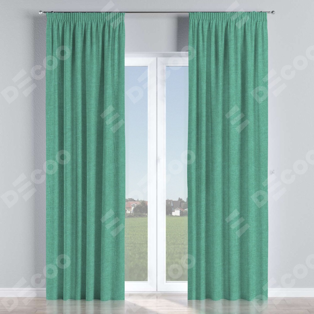 Комплект прямых штор, от производителя «Cortin», пошиты из ткани лён светло-бирюзовый, артикул ткани 53435. С изнаночной стороны в верхней части штор пристрачивается шторная лента с декоративными складками «Карандаш». Для создания элегантных складок прямые шторы шьются по стандарту с коэффициентом 1:2 (на 100 см. ширины проёма 200 см. ширины ткани).