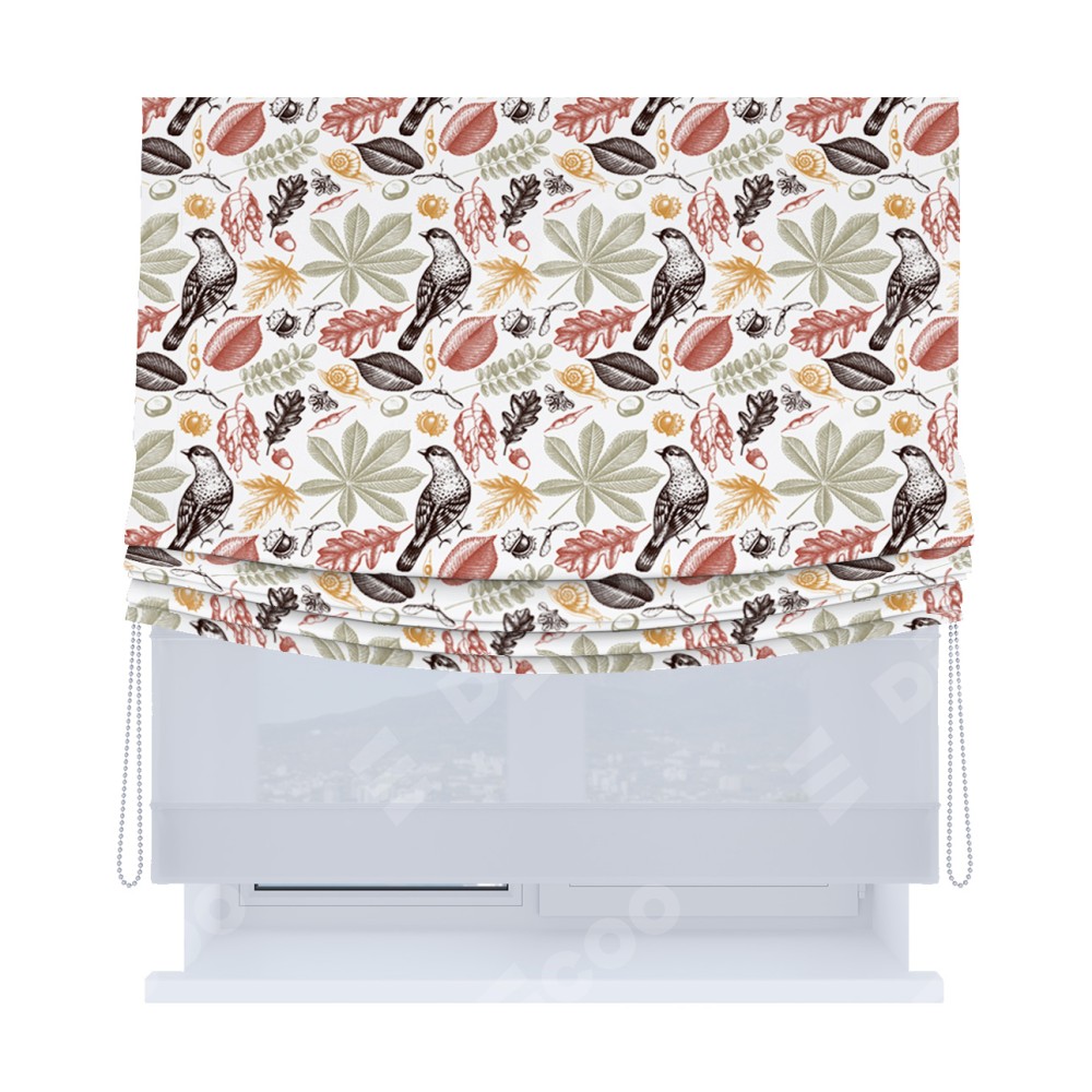 Римская штора день-ночь производителя «Cortin», используется для проёма, пошита из двух полотен, с лицевой блэкаут с нанесением сублимационной печати «Краски осени», вторая ткань тюль (по стандарту комплектуется тюль белого цвета артикул V-01). Имеет универсальный механизм и подходит для монтажа: на потолок, на стену и в нишу. Удобное управление каждой шторой отдельно.