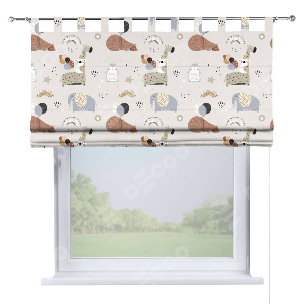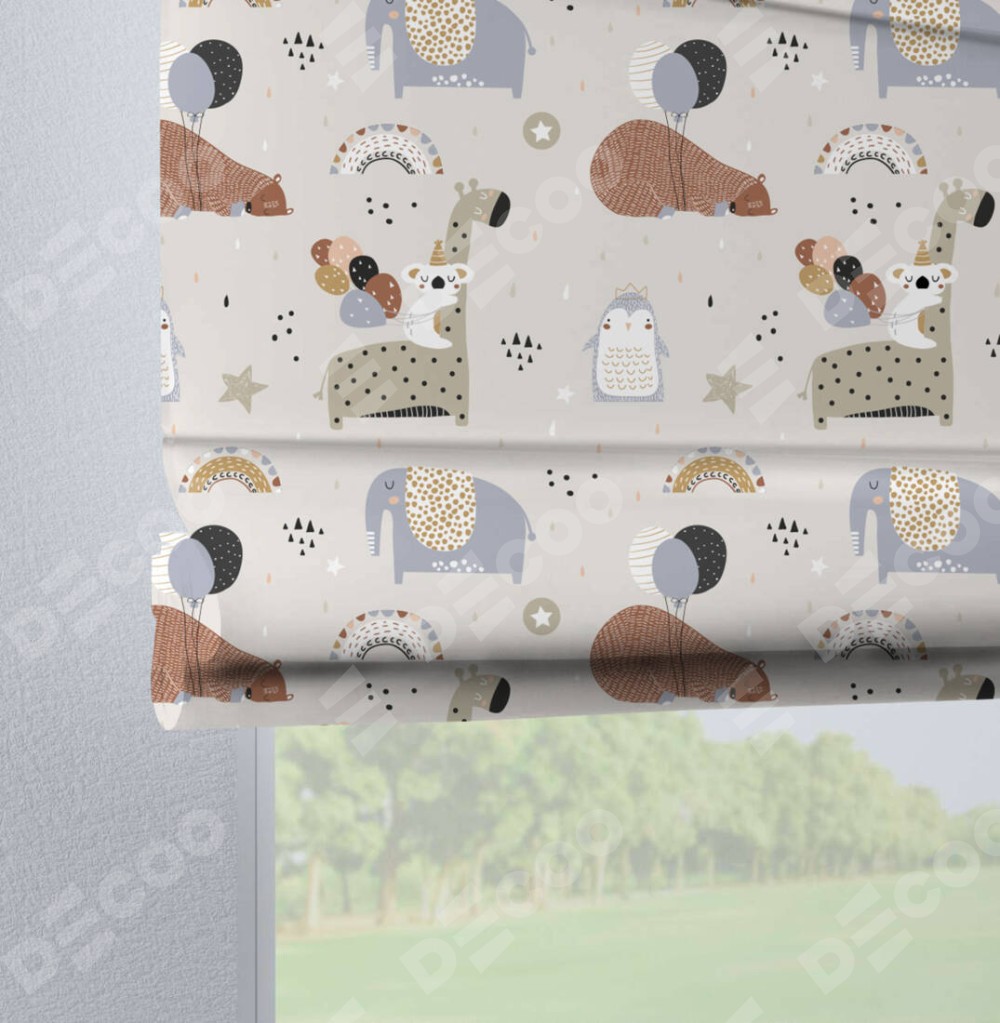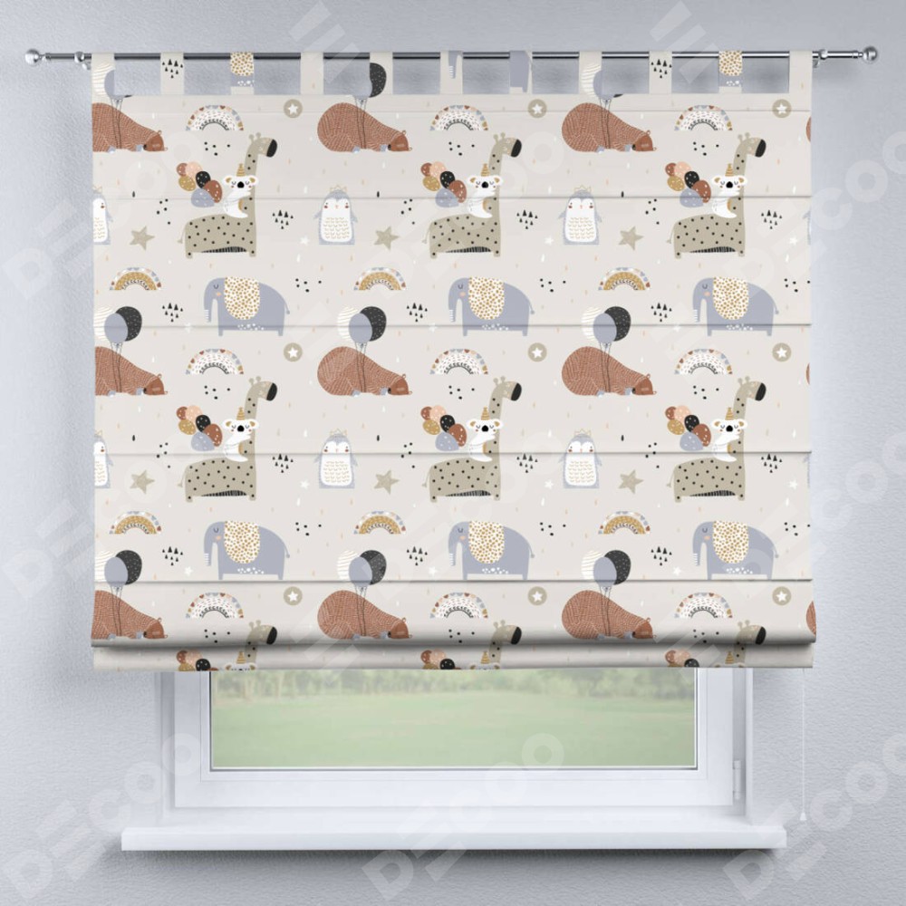 Римская штора производителя «Cortin», используется для проёма, пошита из ткани блэкаут с нанесением сублимационной печати «Вечеринка животных». Данная модель пошита на петлях, комплектуется на выбор круглым карнизом и подходит для монтажа на стену. Римская штора на петлях имеет простую систему регулировки высоты, отличительным преимуществом данной модели является простой способ монтажа. Достаточно повесить ее на трубу и штора готова!