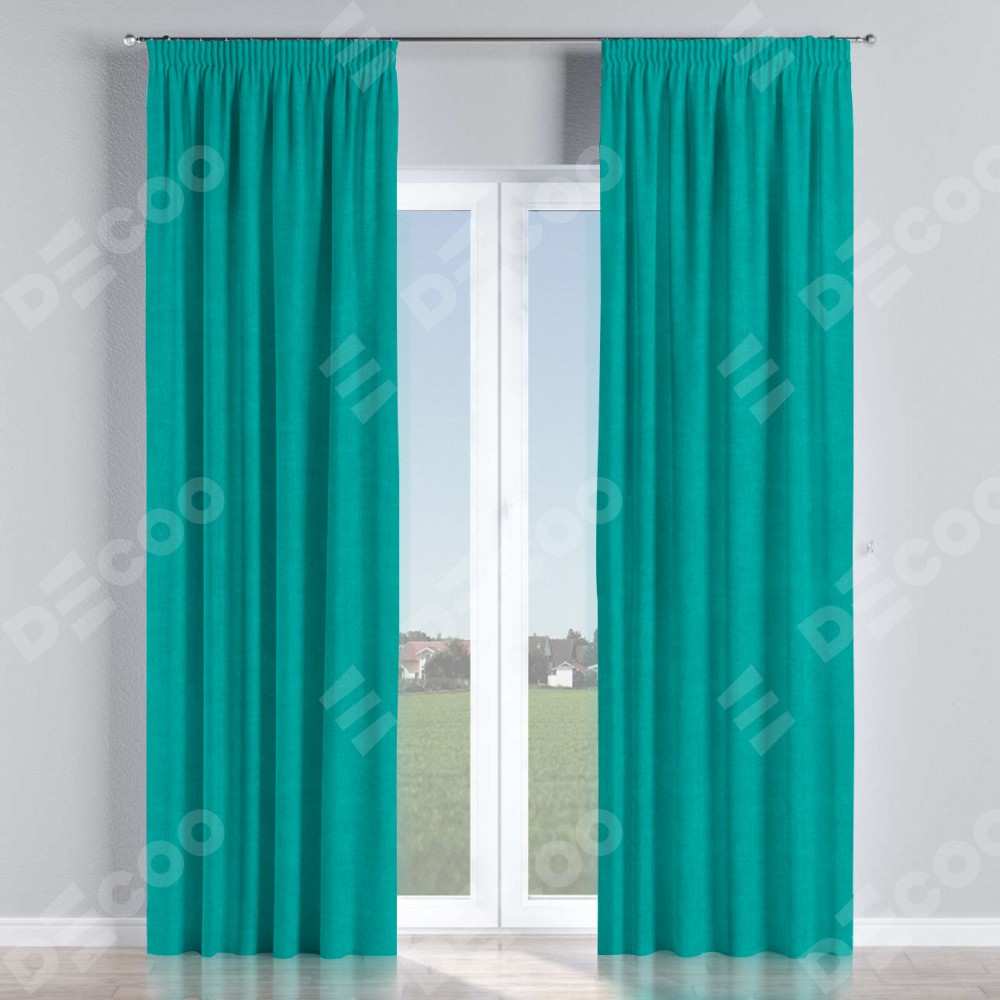 Комплект прямых штор, от производителя «Cortin», пошиты из ткани канвас бирюзовый, артикул ткани v-1048. С изнаночной стороны в верхней части штор пристрачивается шторная лента с декоративными складками «Карандаш». Для создания элегантных складок прямые шторы шьются по стандарту с коэффициентом 1:2 (на 100 см. ширины проёма 200 см. ширины ткани).
