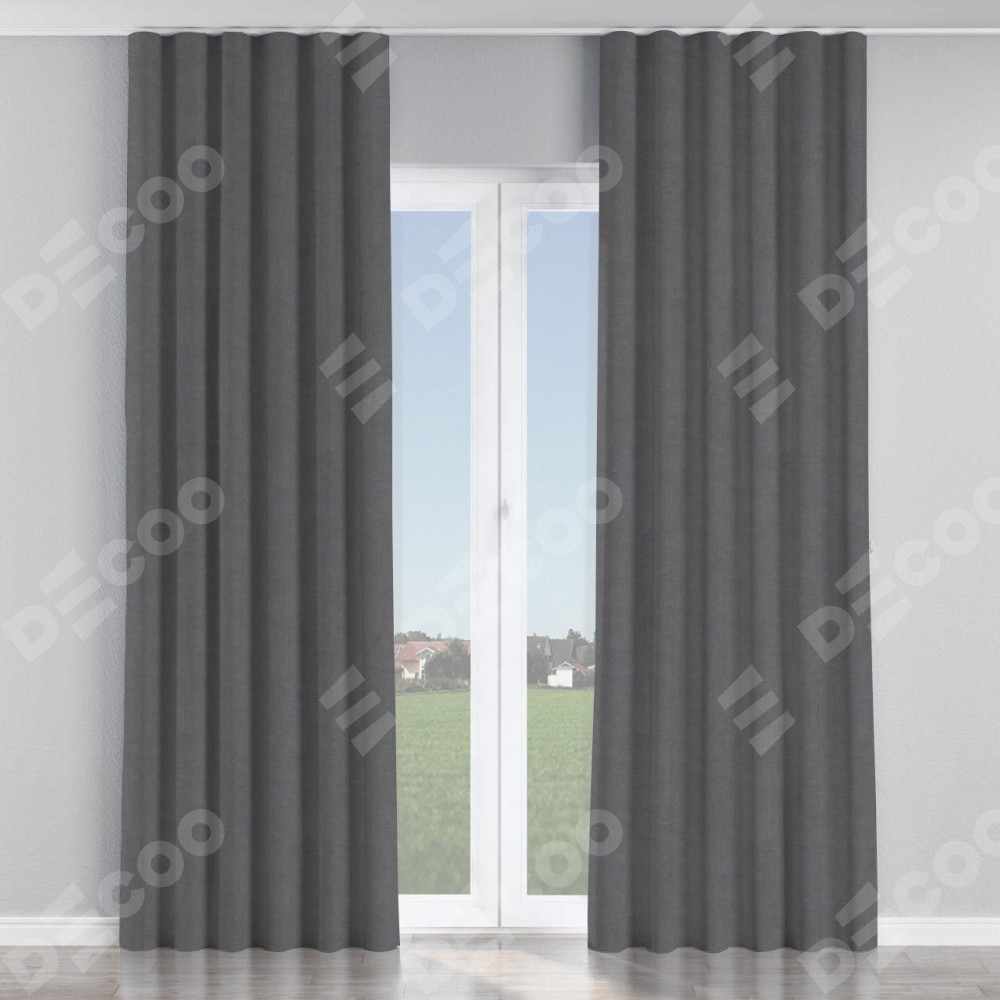 Комплект прямых штор, от производителя «Cortin», пошиты из ткани канвас мокрый асфальт, артикул ткани v-1083. С изнаночной стороны в верхней части штор пристрачивается шторная лента с декоративными складками «Волна». Для создания элегантных складок прямые шторы шьются по стандарту с коэффициентом 1:2 (на 100 см. ширины проёма 200 см. ширины ткани).