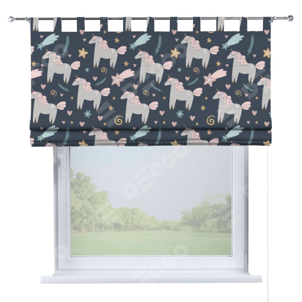 Римская штора производителя «Cortin», используется для проёма, пошита из ткани блэкаут с нанесением сублимационной печати «Милые единороги». Данная модель пошита на петлях, комплектуется на выбор круглым карнизом и подходит для монтажа на стену. Римская штора на петлях имеет простую систему регулировки высоты, отличительным преимуществом данной модели является простой способ монтажа. Достаточно повесить ее на трубу и штора готова!