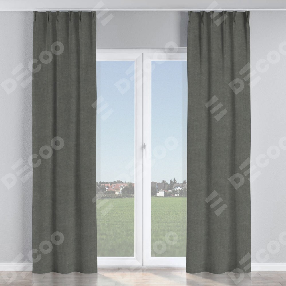 Комплект прямых штор, от производителя «Cortin», пошиты из ткани канвас тёмно-серый, артикул ткани v-340. С изнаночной стороны в верхней части штор пристрачивается шторная лента с декоративными складками «Кустик». Для создания элегантных складок прямые шторы шьются по стандарту с коэффициентом 1:2 (на 100 см. ширины проёма 200 см. ширины ткани).