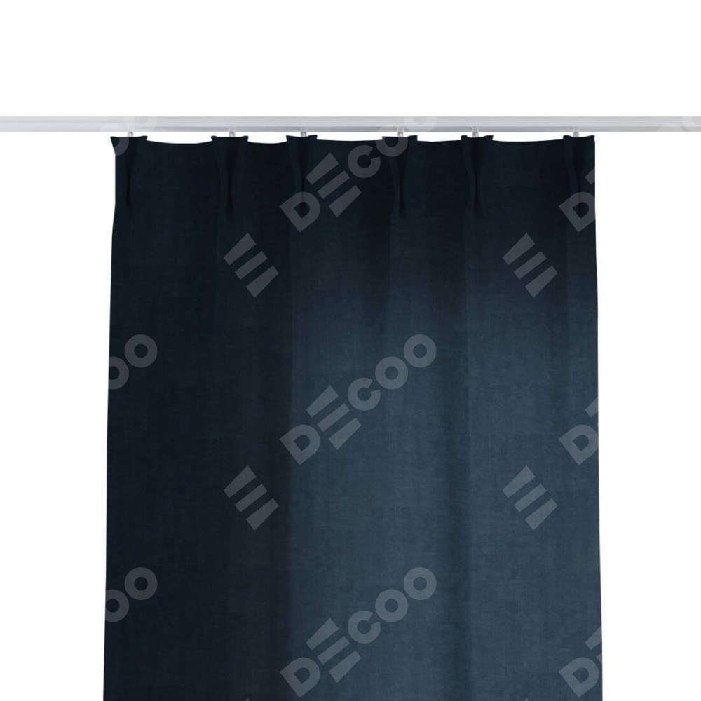 Комплект прямых штор, от производителя «Cortin», пошиты из ткани канвас тёмно-синий, артикул ткани v-206. С изнаночной стороны в верхней части штор пристрачивается шторная лента с декоративными складками «Кустик». Для создания элегантных складок прямые шторы шьются по стандарту с коэффициентом 1:2 (на 100 см. ширины проёма 200 см. ширины ткани).