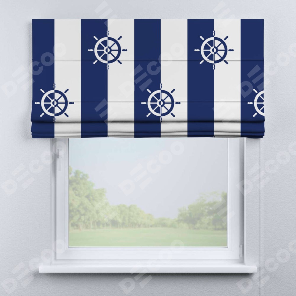 Римская штора «Кортин» для проема «Полоски и штурвалы» доступна к заказу по любым размерам. Её артикул: 26470. Стоимость будет зависеть от размерных характеристик и будет начинаться от 2 403 руб. В интернет-магазине Decoo есть возможность выбрать товар в любых вариациях.